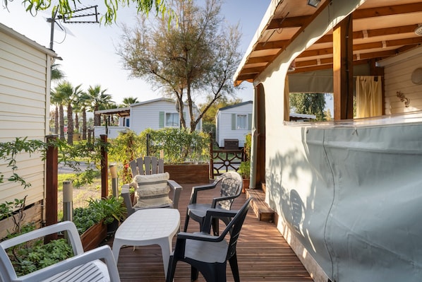 Gelegen in Hyères biedt stacaravan Chez Hervé alles voor een comfortabel verblijf. De woning van 26 m² bestaat uit een woonkamer, keuken, 2 slaapkamers, een badkamer en een extra toilet, en is geschikt voor 4 personen. Extra voorzieningen zijn een tv, airconditioning en een wasmachine. Daarnaast is er een tafeltennistafel voor jullie plezier. Er is geen wifi of handdoeken aanwezig. De stacaravan beschikt over zowel een open als een overdekt privéterras, ideaal om 's avonds te ontspannen.
