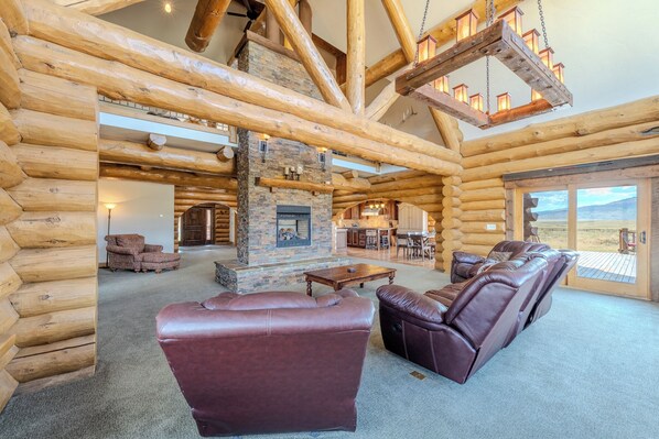 De woonkamer heeft een dubbelzijdige gashaard en comfortabele stoelen.