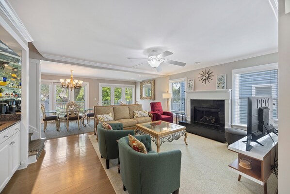 On the first floor, you'll find a spacious living room, a fully equipped kitchen with everything you need to cook up a feast, and multiple welcoming dining areas—perfect for gathering, relaxing, and savoring your vacation. This family-friendly home is thoughtfully designed to ensure a comfortable and restful stay. A generously sized bedroom with queen bed and a private en-suite bath is also located on the main level—ideal for guests or those who prefer easy access without stairs. For added convenience, there is a half bathroom and a full-size laundry room.