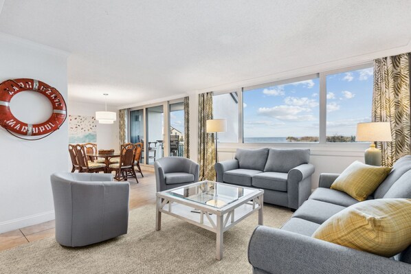 Gelegen ten noorden van Jacksonville aan de onbewolkte zuidkant van Amelia Island, dit prachtige drie niveaus oceaan appartement beschikt over een bijgewerkte keuken en badkamers, prachtig meubilair en een panoramisch uitzicht vanuit de woonkamer en slaapkamers.