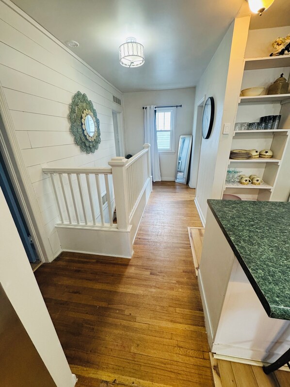 The Space Your private upstairs apartment includes: 3 comfortable bedrooms with fresh linens and cozy beds. 1 full bathroom. Fully equipped kitchen with coffee, cookware, and eating space. Living room with Smart TV. Beautiful natural light and hardwood floors. Free off-street parking behind the home (no street parking stress!).