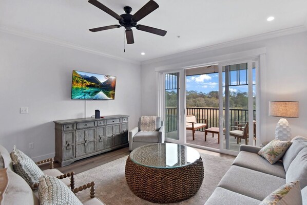 Imagine brand new bathrooms, brand new beds, new new new everything. This tastefully decorated 3 bed/3 full bath 1800 sq ft dwelling offers elegance while being situated in the heart of Georgia’s Golden Isles. The master suite boasts a king bed with an attached full bathroom and a 43-inch wall-mounted Smart TV. Guest room one has a queen bed with a private attached full bath. Guest room two also has a queen bed with a semi-private full bath. Both have 40-inch wall-mounted Smart TVs.