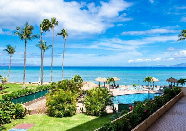Imagine waking up to the sounds of soothing waves, walking out on your private SECOND floor lanai for gorgeous views of Ocean, Lanai and Moloka'i islands, and pool. Whether you're a morning or evening or afternoon person, this spacious studio in a beachfront resort is a fantastic getaway. Relax by watching seasonal Humpback whales, and gorgeous sunsets, surf, swim, snorkel, paddleboard. You can shop in nearby Whalers Village, visit historic Lahaina (Recovering from wildfires), and Golf in nearby Kapalua Bay.