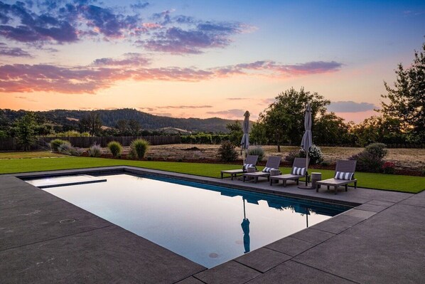 Sonoma Valley Villa can comfortably accommodate your group of up to 10 guests. Gaze at the sunset over the neighboring vineyards from the expansive decks surrounding the house. Lounge for hours in the swimming pool which is heated to a comfortable temperature all year round. Enjoy the large in-ground hot tub or gather around the fire pit for endless night skies and create life-long memories.