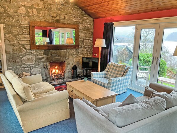 Woonkamer: met open haard, Freeview-tv, dvd-speler, cd-speler en openslaande deuren naar de tuin.