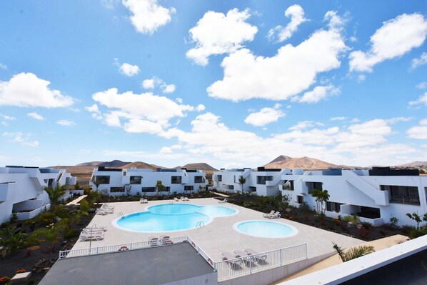 Beautiful Apartment decorated with love by its owners. It overs a fully equipped kitchen, living room, double bed and a sofa bed for one extra guest. This property is suitable up to 3 adults. The roof terrace offers a beautiful view over the complex and surrounding mountain area. The ideal place for a calm holiday very close to the popular areas like surf beach, Corralejo , Cotillo and Lajares. It is necessary to have a car to explore the area.