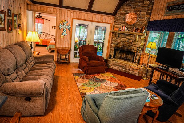 The cabin would be a nice place to stay but there was a bucket of moldy water catching a leak under the kitchen sink. The stairs outside are rotted and about to fall in. I know there are cobwebs expected outside but they are all inside above the living room and all over the master bedroom. Especially over the shower and spiders in the linen closet that I had to spray. The placemats for the table have food all over them. The blue recliner is broken. My dad almost fell out of it. Also, my vacation started with doing dishes. The dishwasher was full of them. They had slimy water on them so I had to wash them again. Overall my family will not be staying in this cabin next year.