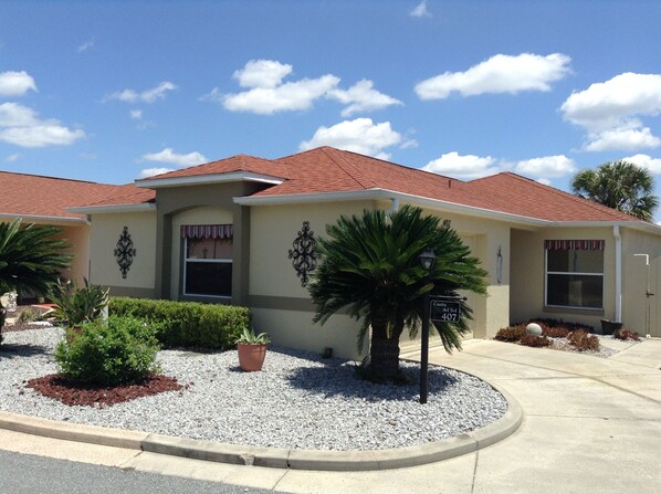Je zult je welkom en ontspannen voelen zodra je de voordeur van je huis opent, weg van huis. Dit huis is prachtig ingericht en beschikt over een heldere open plattegrond. De keuken is compleet met alles wat u nodig heeft om maaltijden te bereiden en te serveren. De eetkamer biedt plaats aan maximaal 4 comfortabel en is een geweldige plek om uw nieuwe en oude vrienden te vermaken! De woonkamer biedt veel comfortabele zitplaatsen als u uw vrienden en familie entertaint of gewoon geniet van uw favoriete televisieprogramma's op de flatscreen-tv. De slaapkamer heeft een comfortabel kingsize bed, grote inloopkast en een eigen badkamer. Het hoofdbad biedt een inloopdouche. De gast slaapkamer twee comfortabele twin-size bedden voor wanneer de kleinkinderen komen bezoeken en genieten. De slaapkamers en beide badkamers zijn ingericht met extra handdoeken en beddengoed. Een uitje nodig om te ontspannen en te genieten van een rustige tijd in de zon? De charmante omsloten Lanai biedt zitgelegenheid voor u om te genieten van het lezen van de ochtendkrant en koffie of middagzon. Het is ook een geweldige plek om te zitten en te ontspannen aan het einde van een drukke dag vol activiteiten. Als je zin hebt om te loungen in de warme zon van Florida, pak dan je favoriete boek en strek je uit in de hangmat op je privé-binnenplaats. Je zult ook een BBQ-grill vinden, dus pak wat hamburgers of steaks voor je avondje koken met je nieuwe vrienden uit Villages voordat je naar het dorpsplein gaat om de hele nacht te dansen!