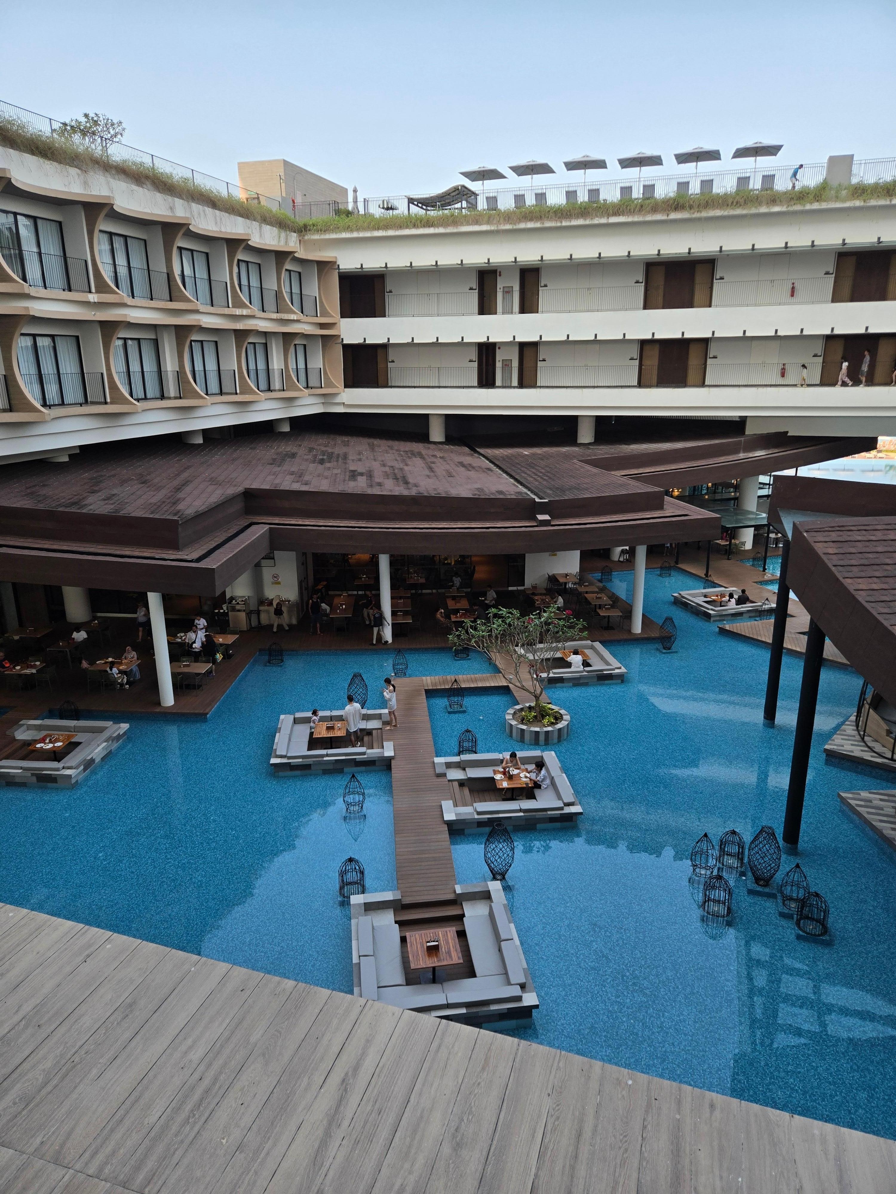 Check-in area was not air conditioned, poor staff standing in the heat all day. Also no seated check in but regular counters, wasn’t a deal breaker but not very 5 star. First room smelled of cigarettes, so we asked for a different room. Staff was very accommodating and gave us an other room with atrium view, which smelled a lot nicer. But we found out later that the switch for the bathroom light wasn’t working, so the lights could not be turned off. Because of the glass wall of the shower, light came through to the sleeping area. It was quite late and we didn’t want to change rooms again, so yeah we just slept with the lights on. No big deal, but not a 5 star experience. Breakfast was nice, had a lot of choices, service was excellent. Gym was nice, pools were nice, great for kids. Very busy hotel so not that romantic for couples, better for families with children.