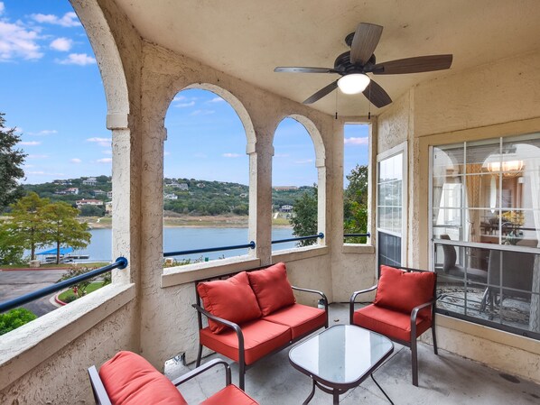 Condo is gelegen aan de rustige kant van het eiland, en heeft een prachtige patio met een prachtig uitzicht op het hoofdgedeelte van Lake Travis, met uitzicht op het prachtige landschap. Het is volledig ingericht, met de ruimte voor maximaal 4 personen, met een kingsize bed en 2 opvouwbare eenpersoonsbedden (opgeborgen in een kast met airconditioning). Geniet van toegang tot gratis overdekte parkeerplaatsen, zwembaden en bubbelbaden, droge sauna's, een fitnesscentrum, spa- en massagediensten, restaurants, tennis, picknick- / grillplekken, een uitstekende golfbaan, wijnmakerijen, jachthaven, fiets- / wandelpaden, etc.