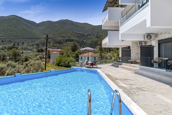 Het studio-appartement beschikt over een eigen buitenruimte met een balkon. De woning heeft toegang tot een gedeelde buitenruimte met een zwembad, een overdekt terras, een barbecue en een buitendouche.