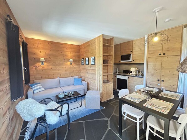 This pretty apartment in the mountains is located on the 2nd floor. It includes an equipped kitchen open to the living room with 1 television. It opens onto a west balcony. For sleeping, you have a sleeping area with a set of bunk beds 80x190 and in the living room a 160x190 convertible sofa. At the entrance level, you will find a bathroom with toilets. At your disposal, a ski locker at the entrance to the residence.