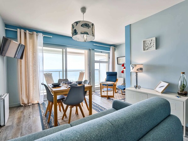 Un salon confortable avec vue sur la mer, équipé d'une TV, d'une table et de chaises pour vos moments de détente