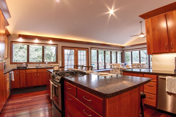 This Property was every bit as BEAUTIFUL pictured. It was very well stocked, dish soap, tp, hand soap in bathrooms, dish washer and laundry tabs. The lay is perfect for larger groups and plenty of area for smaller children to play. We took 4 Kayaks and daily paddled out to the sand bar or even ventured into the bay part depending on the wind. We seen Bald Eagles, Deer, Snapping Turtles and other wild life while sitting on the back deck in the evenings. Total relaxation! Our group also brought bikes and enjoyed early morning & evening rides where we seen lots of deer up close. The bikes were also nice to ride back and forth to the small beach near by. They younger part of our group even biked to Elm beach a few miles away while the grandparents & toddles drove. Elm Beach is a great park for smaller kids and the beach was very nice, not crowded during the week days. The Pool... well one word Excellent! We used the pool everyday and loved it. We did take a small blow up kiddy pool for our 2 & 3 year old grand kids which worked out wonderful. The only thing that we could of used was some shade by the pool area. We did end up running out to buy an umbrella to give some of us that burn easy shade access. Id recommend bringing a small easy up if you have one. The young couple next door was very nice and friendly when we seen them. This was by far one of the nicest houses we have ever rented and I'd highly recommend it to anyone who loves seclusion with a bit of mountain yet beach feel. Lots to do and all around great place.