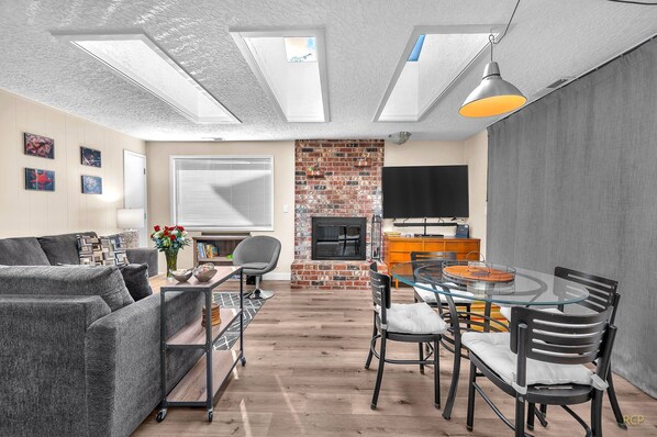 A large flat-screen TV with streaming services, a DVD/Blu-Ray player, and a selection of movies are available in the living room for entertainment. You can also connect your device to the sound bar via Bluetooth to enjoy music while you cook. The wood fireplace is perfect for cozying up on cool evenings. You'll also find board games, Wi-Fi, and two kites to enhance your stay.