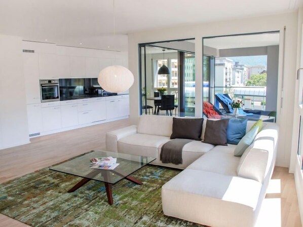 Dit appartement bevindt zich aan het meer en biedt onder andere een keuken en een balkon