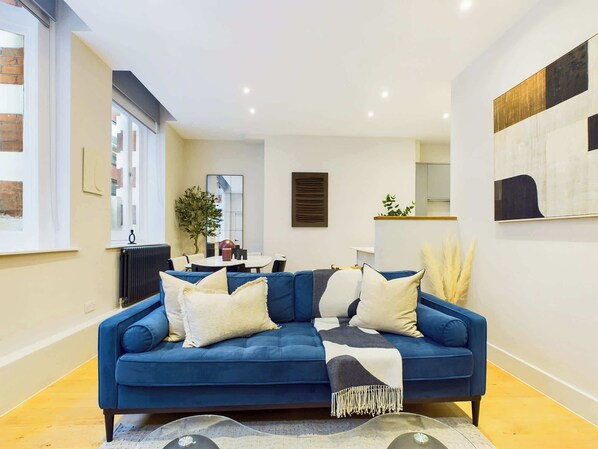 Based just beside one of London's most iconic areas, this thoughtfully designed apartment combines modern comfort with effortless style. The open-plan living, dining and kitchen area provides the perfect space to unwind after a day exploring the city. A fully equipped kitchen with integrated appliances and sleek finishes flows seamlessly into the dining area, with seating for six, and a cosy lounge featuring a Smart TV and comfortable sofa; perfect for nights in.