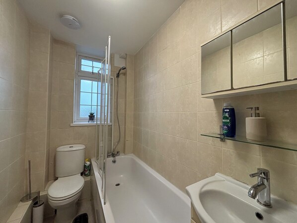 The sleek four-piece bathroom offers a bath with a shower option, perfect for either a relaxing soak or a quick refresh. A mirrored cabinet provides convenient storage, and a heated towel rack ensures plush, warm towels are always at hand.