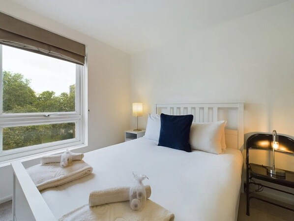 The spacious bedroom is your private haven, features a comfy king-size bed dressed in plush linens, ensuring a restful night's sleep. The window next to the bed looks out over the treetops of London Fields, and double-glazed windows keep the room quiet and peaceful. A generous walk-in closet provides ample space for your belongings, keeping the room tidy and clutter-free.