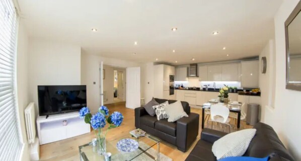 Your apartment is on the ground floor of a converted Edwardian building with step-free access. The master bedroom has an ensuite shower room and the large main reception room is large enough to house the kitchen area, dining table, living area and also features a large double sofa bed.