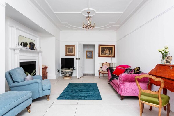 Een lichte en rustige leefruimte, met een bank, fauteuils en een wit marmeren open haard. Er is een televisie in de hoek van de kamer. Aan de ene kant is er een klein bureau en een bureaustoel die kan worden gebruikt als een werkruimte.