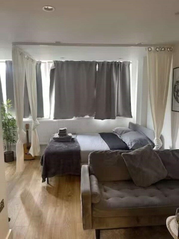 Our studio is a true gem, designed for comfort and style. Bright and airy, it's the perfect space to unwind after a day of exploring. Sink into the plush sofa and admire the unique artwork adorning the walls. The top range Simba bed promises a restful night's sleep, while the fully equipped kitchenette invites you to whip up a delicious meal or enjoy a glass of wine. You'll find all the amenities you need for a memorable stay.