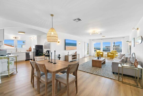 -Living room/dining room is open, with large windows