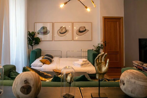 De woonkamer is schattig en gezellig en met afwerkingen zoals de kleurrijke kussens die passen bij de banken die een ruimte creëren die uitnodigt om te ontspannen en te ontspannen. Neem een pauze op de bank of ga zitten op een van de twee eigenzinnige fauteuils en kijk naar de flatscreen, 80-kanalen kabel-tv of bespreek de hoogtepunten van je dag in Madrid.