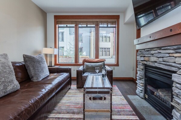 In de woonkamer stroomt licht door een groot raam en een glazen deur naar het privéterras, waar een zithoek u uitnodigt om de dorpssfeer op te snuiven. Binnenin een lederen bank en clubstoel over de volle lengte, beide geaccentueerd door oversized bontkussens, frame een antieke koffietafel met koffer en gestapelde stenen open haard op gas. Een groot tv-scherm hangt boven de mantel en creëert een gezellige omgeving voor een filmavond.