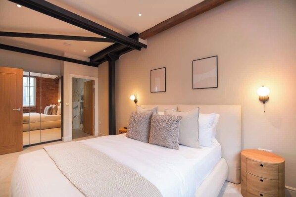 Morning light filters through tall mill windows, illuminating exposed brick and timber beams that hint at the building’s industrial past. You can sink into the sofa with coffee in hand as the hum of the city rises outside, or take a slow start to the day before wandering to the nearby Cathedral or Northern Quarter cafés. Inside, thoughtful details and open spaces create a balance between history and comfort.