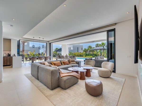 This newly constructed villa is designed with your ultimate comfort and relaxation in mind. As you step inside, you'll be greeted by a spacious living area equipped with state-of-the-art amenities such as Sonos speakers and an 85” TV for perfect, cozy nights in with your loved ones. The open-plan layout seamlessly connects the living space to a fully equipped kitchen boasting top-of-the-line appliances including a Nespresso machine and WMF utensils, making cooking a breeze.