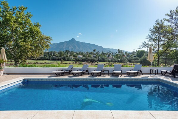 De villa, in een rustige doodlopende straat, ligt in zijn eigen ommuurde tuin met uitzicht op de 12e fairway van Las Brisas Golf en met een prachtig uitzicht op de bergen. Er is een 26ft door 16ft prive verwarmd zwembad, groot terras met veel ligstoelen. De villa heeft 6 slaapkamers, twee hebben een eigen badkamer, twee hebben een eigen badkamer met douche en de andere 2 slaapkamers delen een badkamer / douche. Het heeft een grote woon / eetkamer. Het huis is op twee niveaus, begane grond en kelder. De kelder, bereikbaar via een wenteltrap vanuit de woonkamer, heeft een eigen toegang tot de tuin en een eigen terras. Er is air-conditioning / verwarming. naar de villa. TV met Sky, werkende open haard voor de winteravonden, Wi-Fi-verbinding en alarm. Nieuwe, volledig uitgeruste keuken en bijkeuken. Extra schoonmaak beschikbaar en welkomstpakket. Stranden van Puerto Banus een korte 15 minuten lopen en diverse golfbanen slechts enkele minuten. Auto geadviseerd. Maximaal aantal personen 12 personen minimum 6. Prijs per kamer op basis van behoeften.