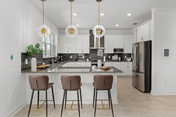 Grab a bar stool and cozy up to the counter so you can oooh and aaah at the stunning touches featured in this gourmet kitchen. High-end stainless-steel appliances, cool white cabinetry, and glistening steel subway tiles set the stage for aspiring chefs to whip up a feast (or two or three!). A full complement of kitchen tools, counter appliances, cutlery, and crockery are included to ensure everything you need is at your fingertips.
