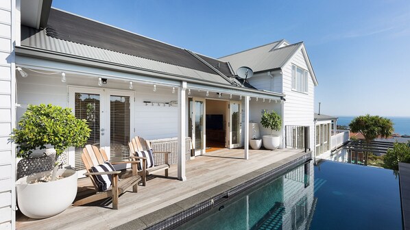 Luxe strandvilla in Hampton-stijl, zwembad, prachtig uitzicht op de baai en entertainer dekken.