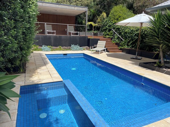 The house is set in the middle of a 1000+ sq metre garden with views out to the garden and pool through glass walls and sliding glass doors. Your time will likely be spent in or around the large pool, in the Spa, or relaxing on the reclining lounge chairs in the Cabana looking over the pool, or on one of the terraces.