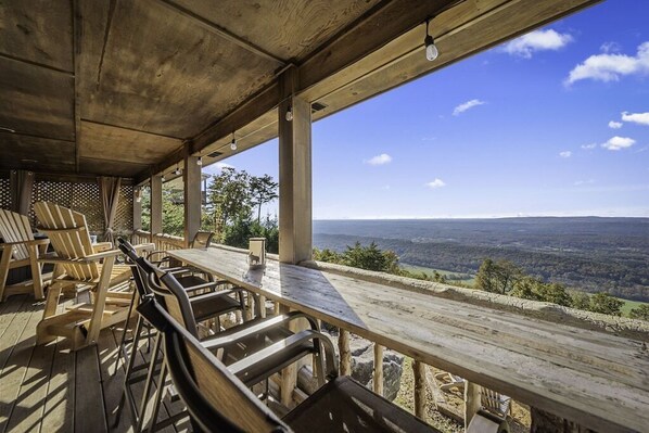 The amazing outdoor covered living space is so relaxing and peaceful. It offers a hot tub, outdoor dining, a gas grill and comfortable oversized Amish rocking chairs that enable you to see the view and not look at the railing. The deck also overlooks incredible boulders with space to roam or enjoy the new solo stove bonfire = low smoke & hot fire with comfortable Adirondack chairs.