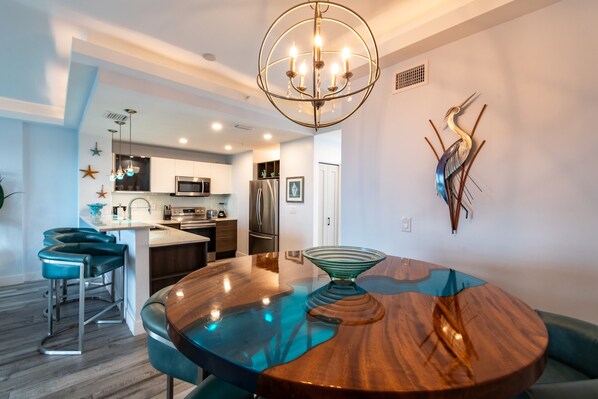 Indulge in the upscale ambiance of our Stateroom Elite, positioned on a higher floor to guarantee stunning, unobstructed views of the canal and beyond. This 3-bedroom unit mirrors the elegance and amenities of our standard Waterfront Stateroom, including a king bed in the master, queen beds in additional bedrooms, and a modern, open-plan living space. Witness rocket launches and dolphin sightings from a north-facing glass balcony, offering a premium perspective on the natural beauty.