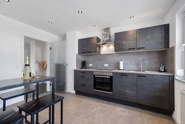 - Keuken: De volledig uitgeruste nieuwe keuken laat niets te wensen over. Met een bartafel en stoelen is er ook ruimte voor een hapje of een gezellig samenzijn tijdens het koken.