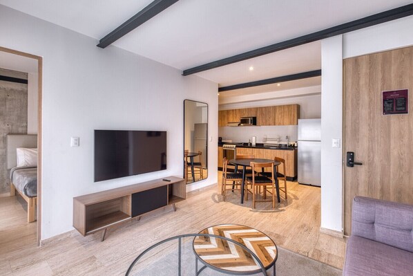 The apartment has a king-size bed, a full bathroom with double access, a living room, a dining room and a fully equipped kitchen. Roof top with a view to Reforma Avenue