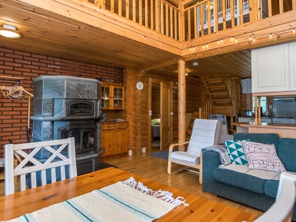 Log cottage built in 2001. Downstairs kitchen, living room, bedroom with double bed. Washroom with washing machine, shower and toilet, sauna (wood stove). Entrance to sauna and washing facilities only via terrace. There is open sleeping loft where 120 cm wide bed, 2 x 80 cm wide beds side by side, a junior bed and a cot. A balcony. The maximum number of people may be exceeded by one child sleeping in cot or junior bed.
