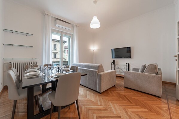 Spacious and bright flat in the heart of Navigli, ideal for families or groups. Two bedrooms with double beds. Living room with dining table, sofa bed, armchair bed and Smart TV. Separate kitchen with breakfast table. Two full bathrooms, one with shower and one with whirlpool tub, plus washing machine and dryer. All rooms are connected by a long central corridor that gives continuity to the spaces and a pleasant feeling of home.