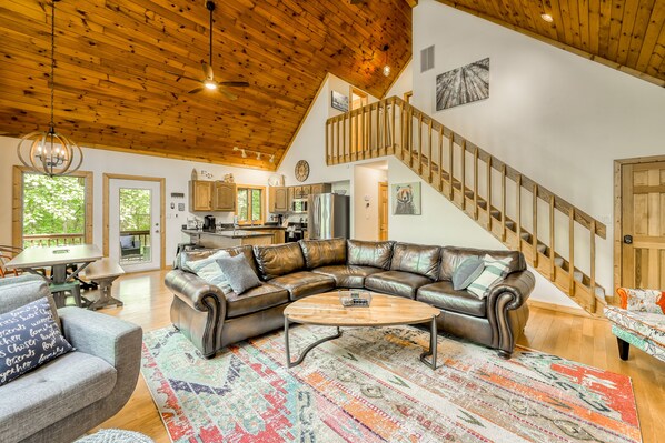 The high, vaulted ceiling and floor-to-ceiling windows give this home a bright, open, and airy feeling. The fully equipped kitchen boasts all stainless steel appliances and is stocked with everything needed to cook a great meal. The large deck is the perfect place to gather for a cookout or just relax, listening to the sounds of nature. Challenge your friends or family to a game of foosball or air hockey. A rarity for the area, high-speed WiFi is equipped for remote working convenience. At the end of the day, rest your head in one of the spacious rooms for a good night's sleep.