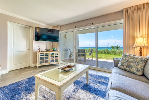 Enter condo B101 at Beach House Condominiums to an open, airy beachy welcome! This property is located directly on the beach with no streets to cross. It is a beautiful two bedroom, two bathroom condo sits on the ground floor and it is centrally located near the pool deck, gazebo, tennis courts, and grill area. Stepping outside onto the covered walk out patio, you are met with a gorgeous view of the Gulf of Mexico and the white sandy beaches of the Emerald Coast! You can hear the waves crashing and almost feel the surf splash right from the walk out patio!