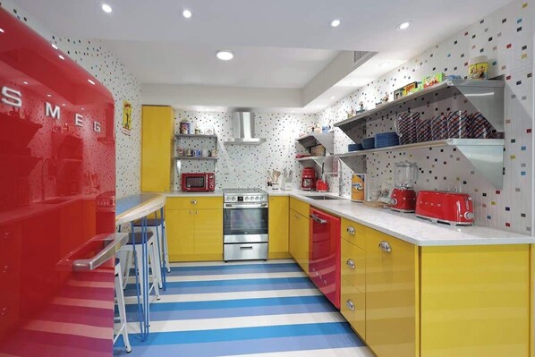 The living room features a large smart TV, a vintage Popeye pinball machine, comfortable seating, and colorful décor, all of which create an inviting atmosphere. The open-concept design flows into the fully equipped kitchen, with high-end Smeg appliances and plenty of counter space for preparing meals. The adjacent dining bar is perfect for enjoying a meal with friends and family.