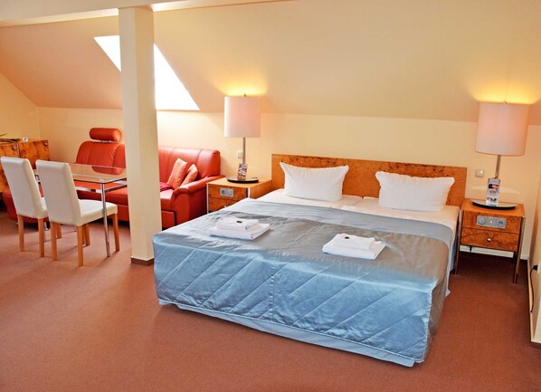 Deze tweepersoonskamer is 28 vierkante meter en voor max. 3 gasten en een kind in een kinderbed modern en vriendelijk. Aangename kleuren, comfortabel meubilair en grote ramen geven u snel een vakantiegevoel. Voorzien van een comfortabel tweepersoonsbed, een kledingkast, een minibar, stoelen en een tafel en een flatscreen-tv met radio. Op verzoek kan een reiswieg met beddengoed en / of een extra bed voor een derde gast worden verstrekt. De moderne badkamer is uitgerust met douche, ijdelheid en toilet. In sommige kamers is WiFi gratis beschikbaar. Voor het ontbijt verwachten we u 's ochtends in ons ontbijtrestaurant bij het gastronomisch buffet. Op verzoek kunt u 's middags op ons zonnige terras genieten van uw koffie in de ochtend of thee of zelfgemaakt gebak en speciale koffies.