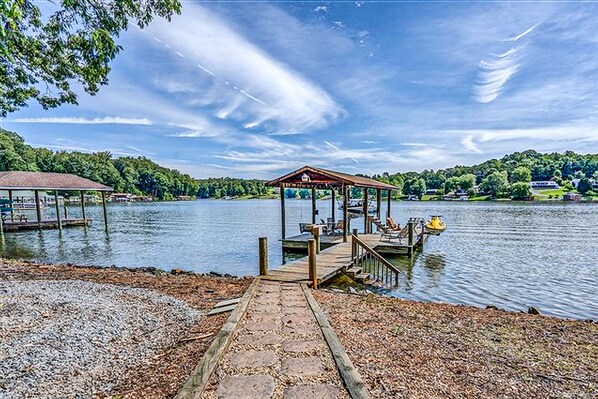 Waterfront home with private dock, lake views, kayaks, paddleboat, & pool table