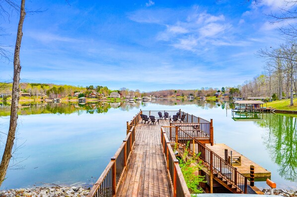 Waterfront lake-view home with dock, fireplace, pool table, kayaks, & firepit