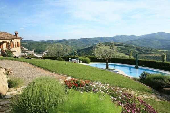 Villa met een buitenzwembad en een restaurant in Monte Santa Maria Tiberina