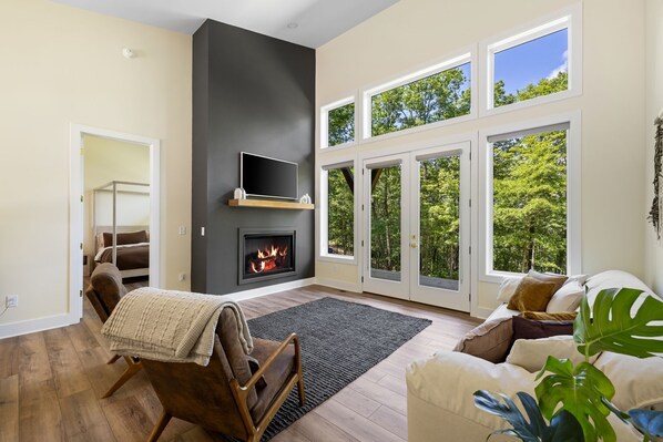 Step inside to a sun-filled open-concept living space with soaring ceilings, a curated minimalist aesthetic, and large windows showcasing the wooded views. The living area flows seamlessly into the kitchen, creating the perfect atmosphere for gathering and relaxing.