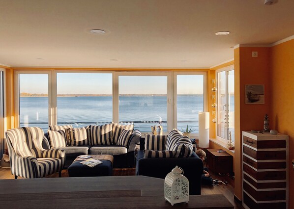 De ruime woonkamer op de eerste verdieping biedt een volledig panoramisch uitzicht van 180 graden op de Goitzschesee. Stijlvolle, moderne banken en meubels met een maritieme kapitein flair bieden comfortabele ruimte voor 6 personen. De hoek open haard geeft een gezellig gevoel van rust en ontspanning, vooral in de koele seizoenen. Natuurlijk is er ook een grote flatscreen-tv, die slim is verborgen in een kast en kan worden verwijderd met de afstandsbediening. Het hele huis heeft WiFi en elke kamer heeft een LAN-aansluiting voor gratis internet. De buitentrap leidt naar het zonnedek op het dak.